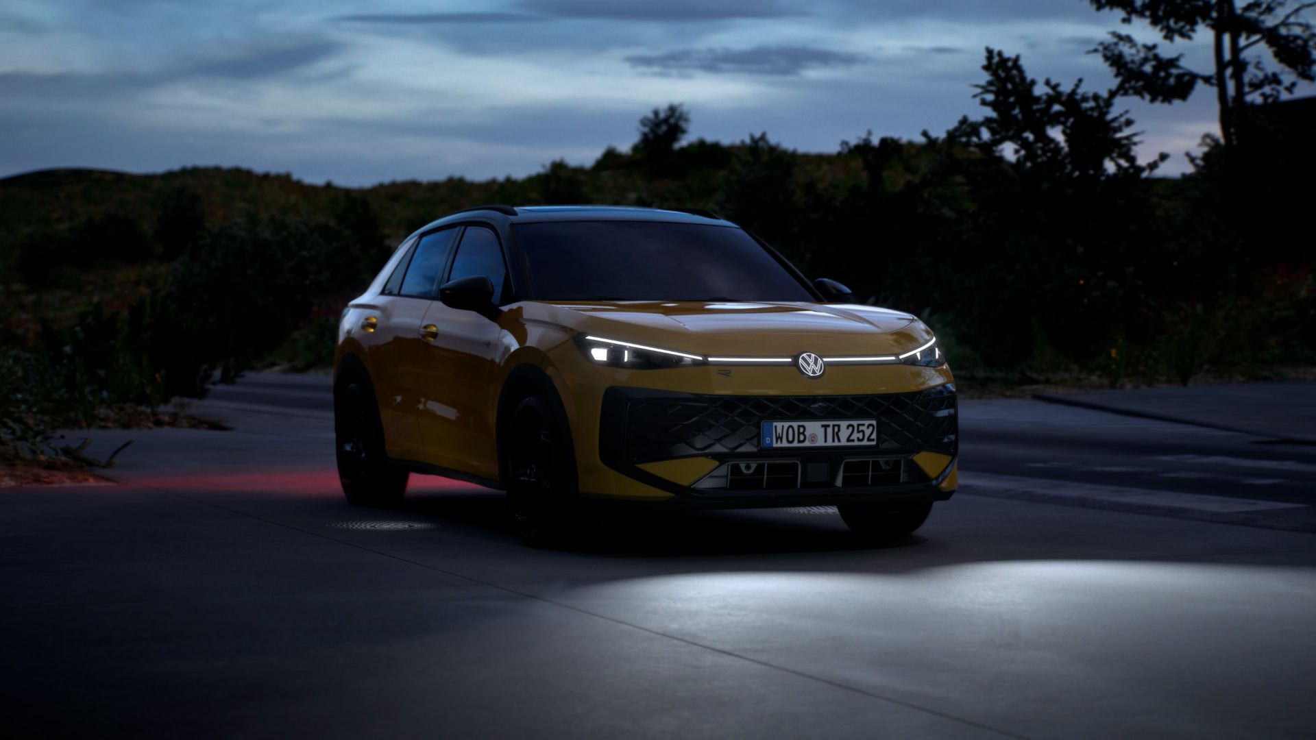 Um VW T-Roc R-Line amarelo atravessa um ambiente urbano à noite.